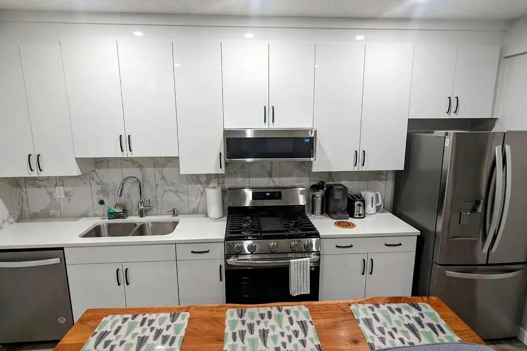 Er is een keuken in de villa in de Northeast Edmonton wijk compleet met een magnetron, een waterkoker en een koelkast.